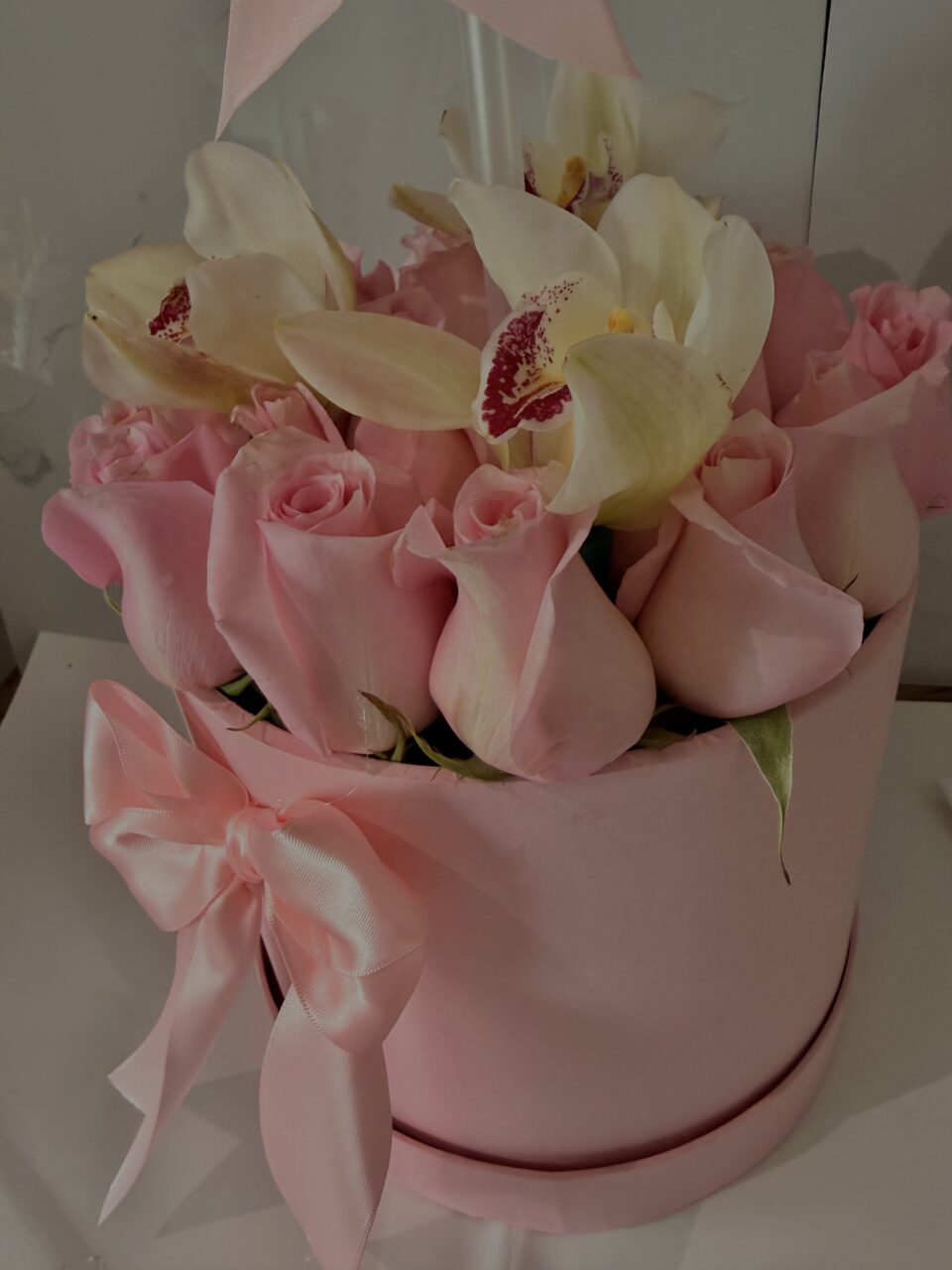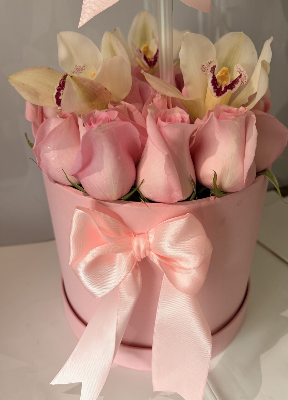 Hermoso y moderno arreglo de 24 rosas y orquídeas en caja cilíndrica, decorada con un lindo y delicado moño. ( El color de la rosa y caja está sujeto a disponibilidad, sin afectar la calidad o diseño del producto-Perfecto para cualquier ocasión-Entregas a domicilio en Bogotá.